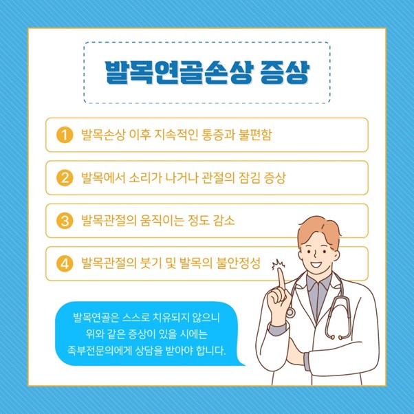 발목연골손상은 주로 발목 부위에서 발생하며 통증, 부종, 발목 안정성 부족 등의 증상을 보입니다. 걷거나 뛸 때 불편함을 느낄 수 있고, 발목을 꼬집는 듯한 느낌이 들기도 합니다. 만약 이러한 증상을 경험한다면 반드시 의료진의 진단과 치료를 받아야 합니다.